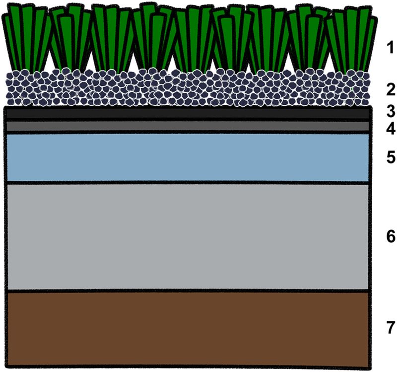 From Murphy & Warner 2022, Environmental Pollution; a cross-section of typical artificial turf.